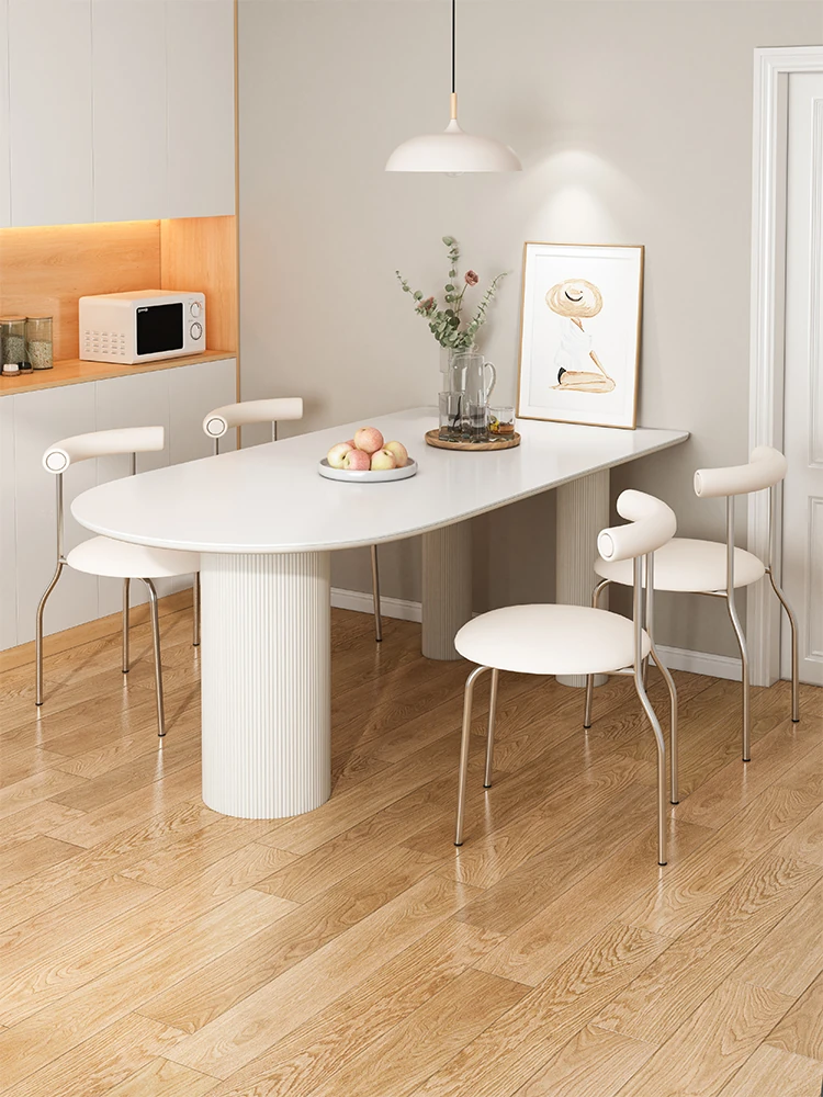 フランス風クリーム仕上げのスリムな岩板ダイニングテーブルセット - 小型住宅向けのモダンでシンプルなデザイン、食事を楽しむための理想的なテーブルとチェアの組み合わせ!